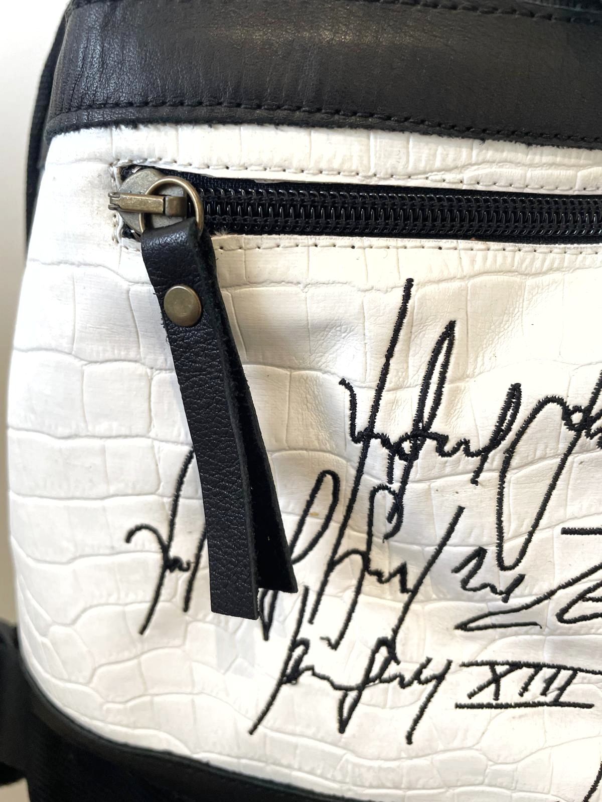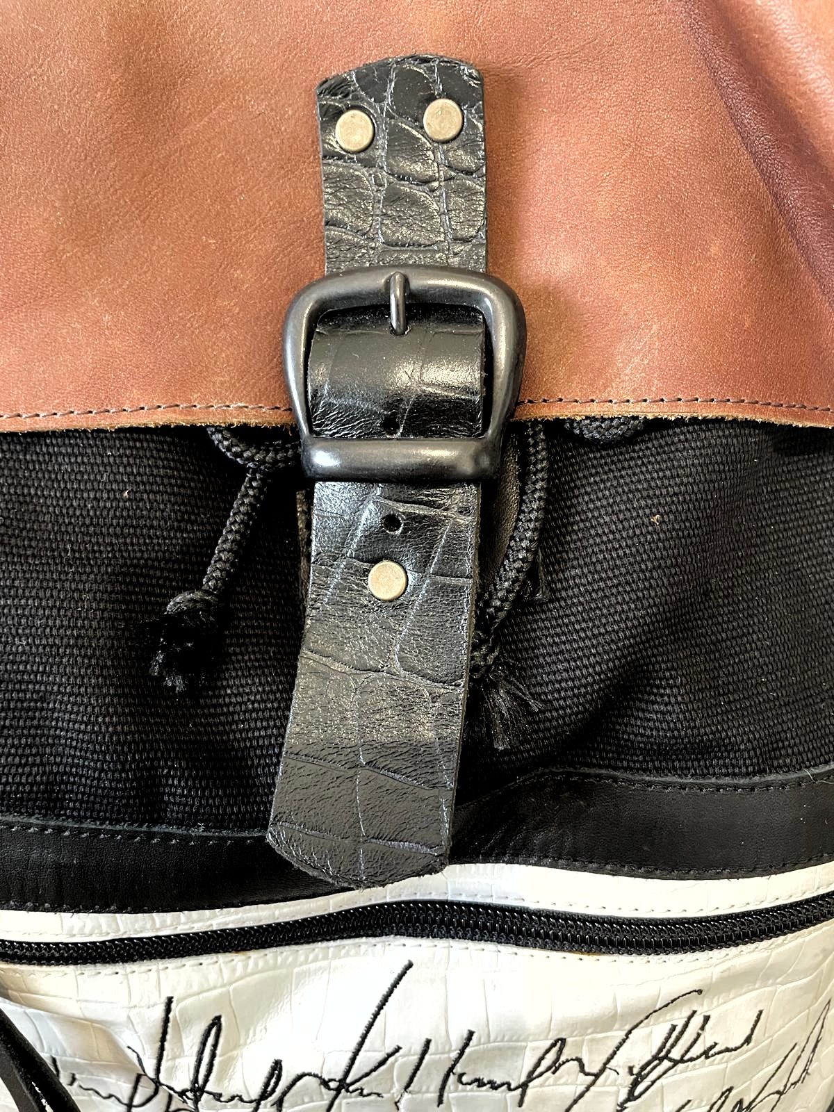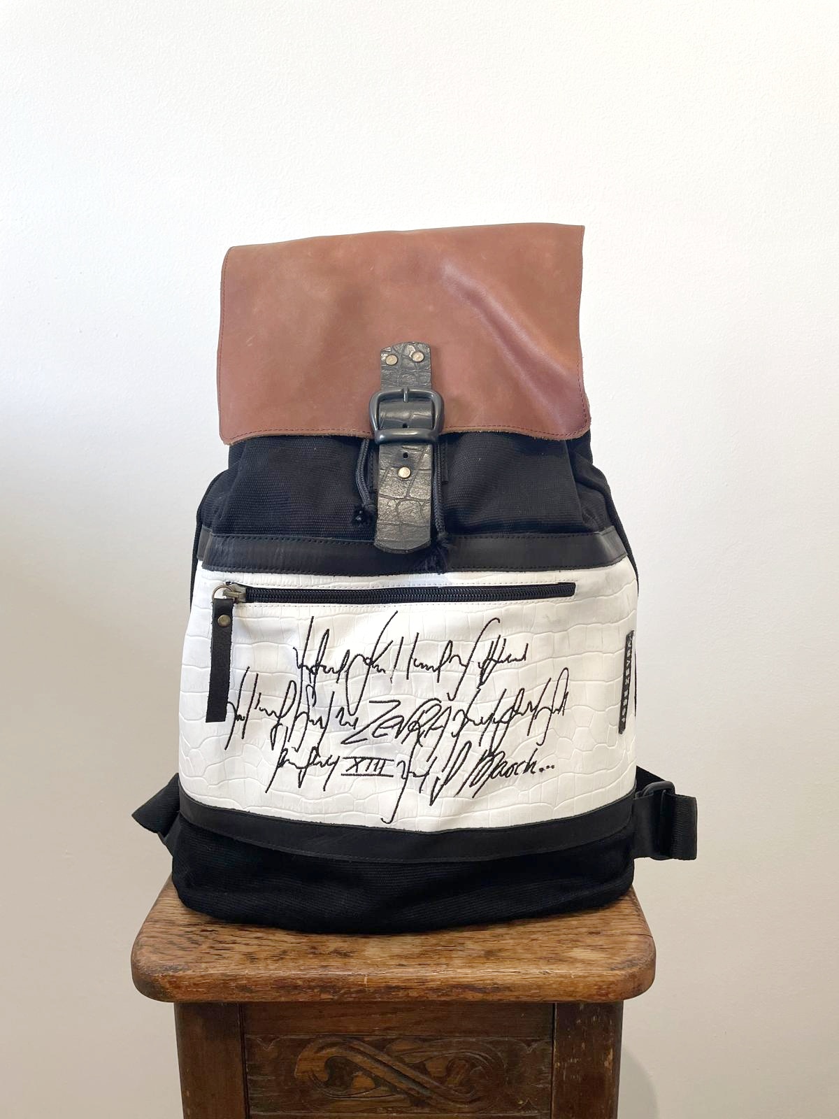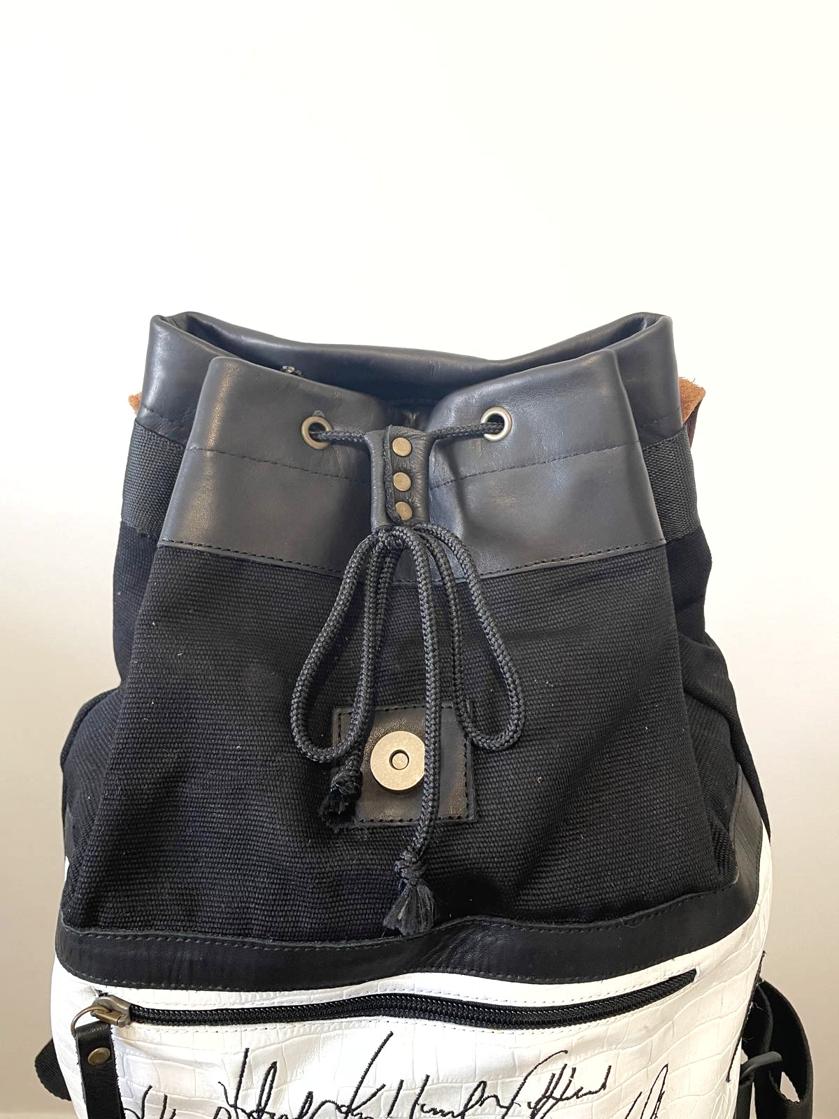 Mochila negra y blanca que combina solapa y zonas de desgaste en piel, cuerpo de lona gruesa con banda de piel sintética dibujo cocodrilo, bolsillo cremallera frontal, interior con forro y bolsillo cierre cremallera. Cierre solapa magnético con adorno de hebilla negra.