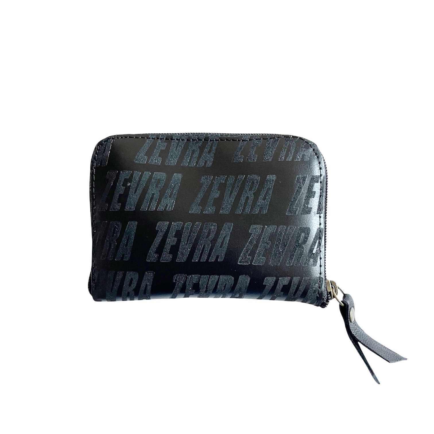 Monedero tarjetero fabricado en piel negra, multigrabado logo a fuego, dos compartimentos, cierre cremallera.