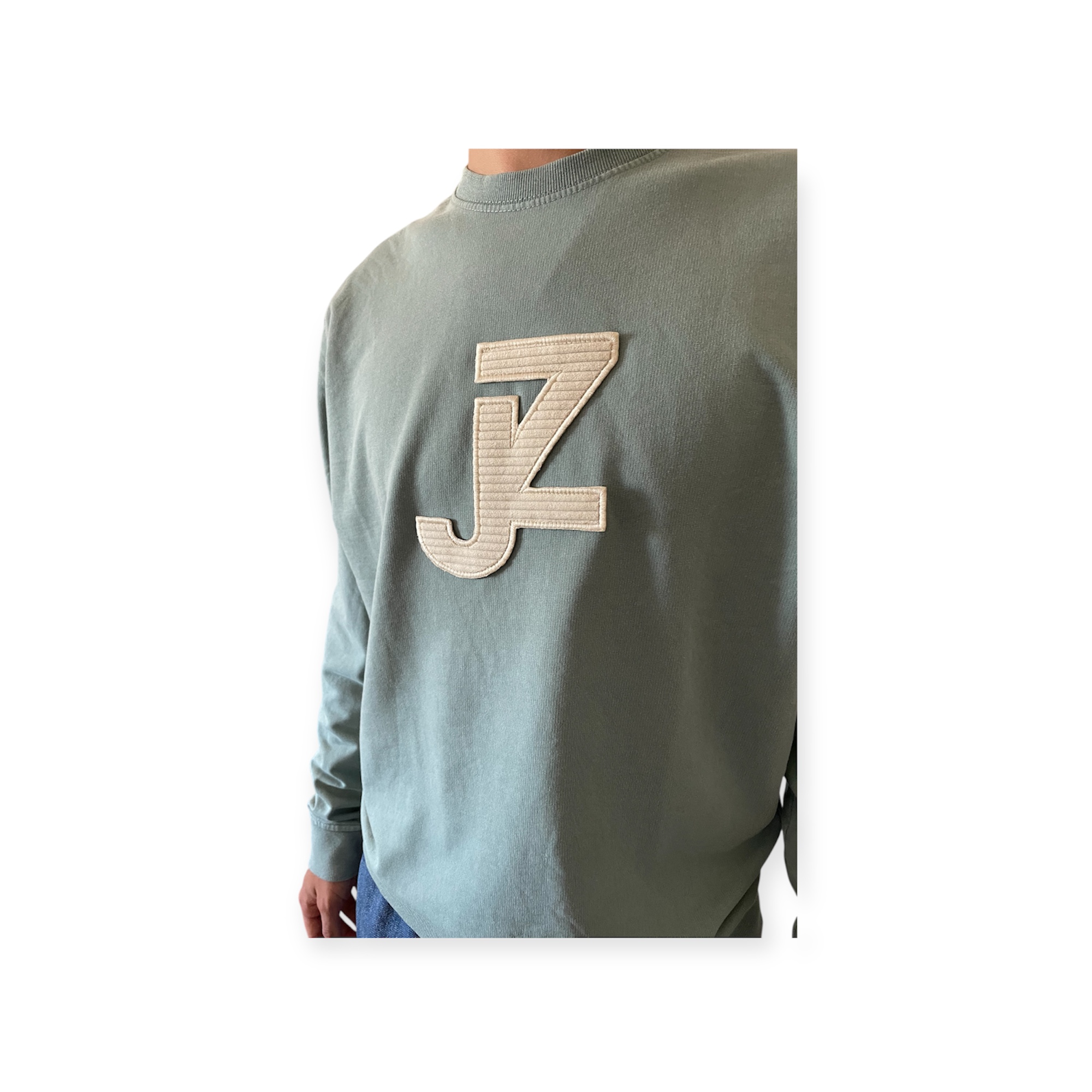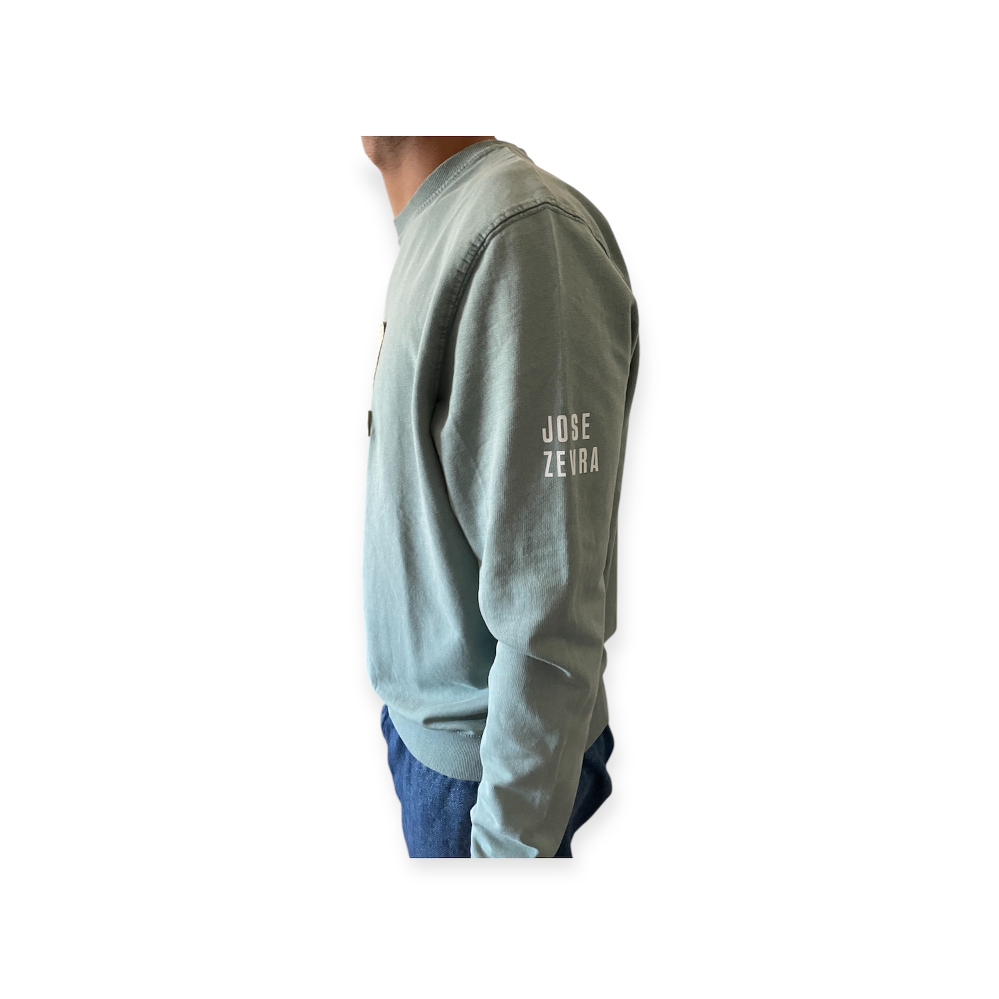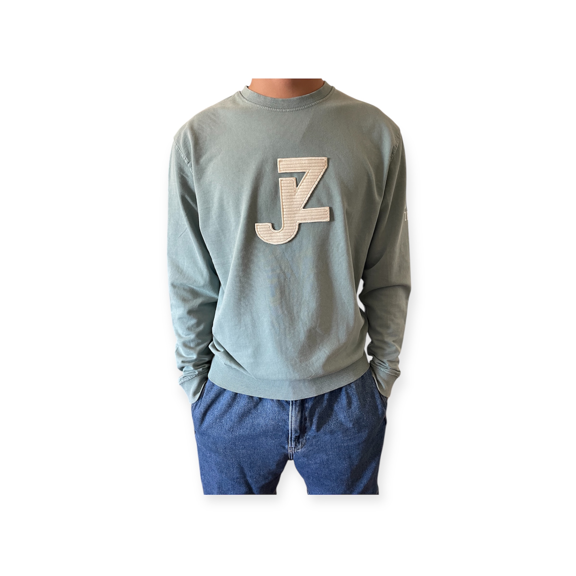 Sudadera básica color azul pato, logo JZ en pecho de pana gruesa color hielo, logo José Zevra en manga izquierda.