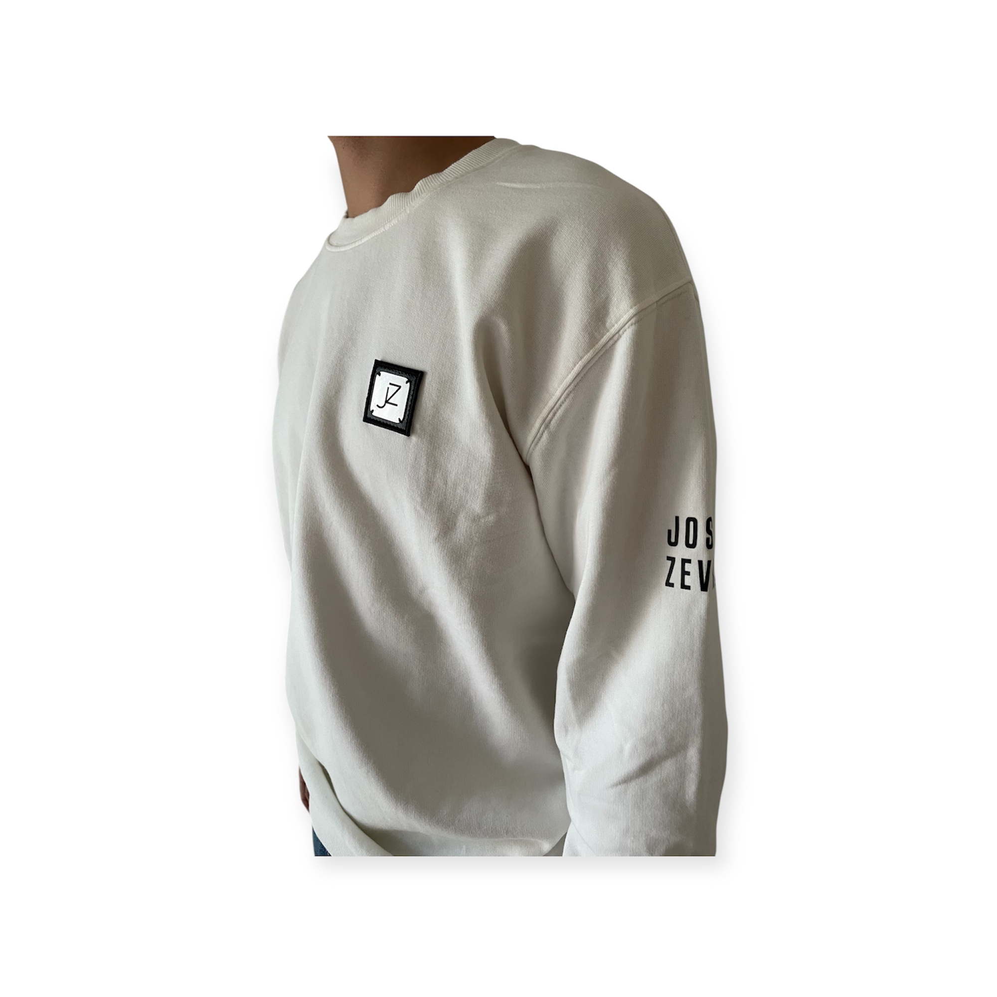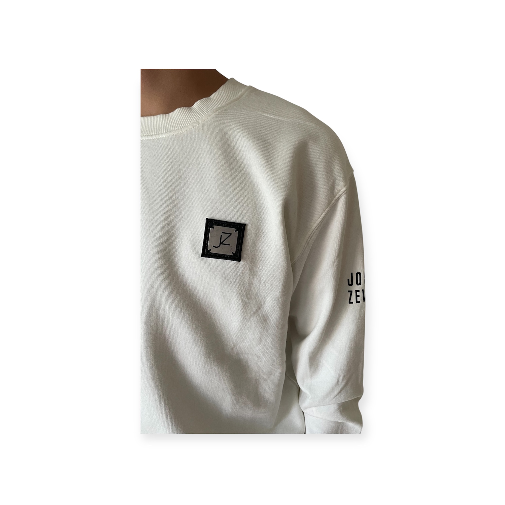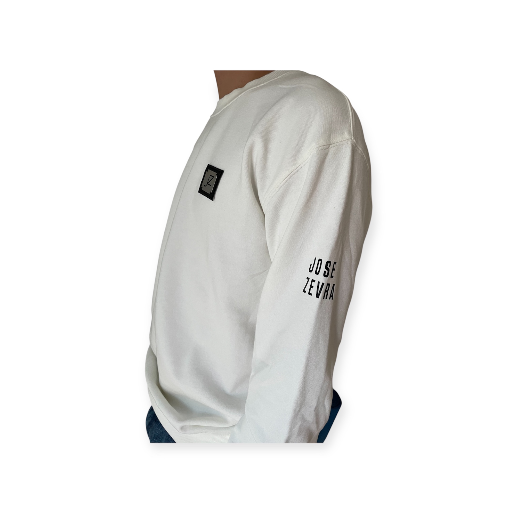 Sudadera blanca 100% algodón orgánico lavado a la piedra, logo metal con adorno piel sintética, logo Jose Zevra en manga izquierda.