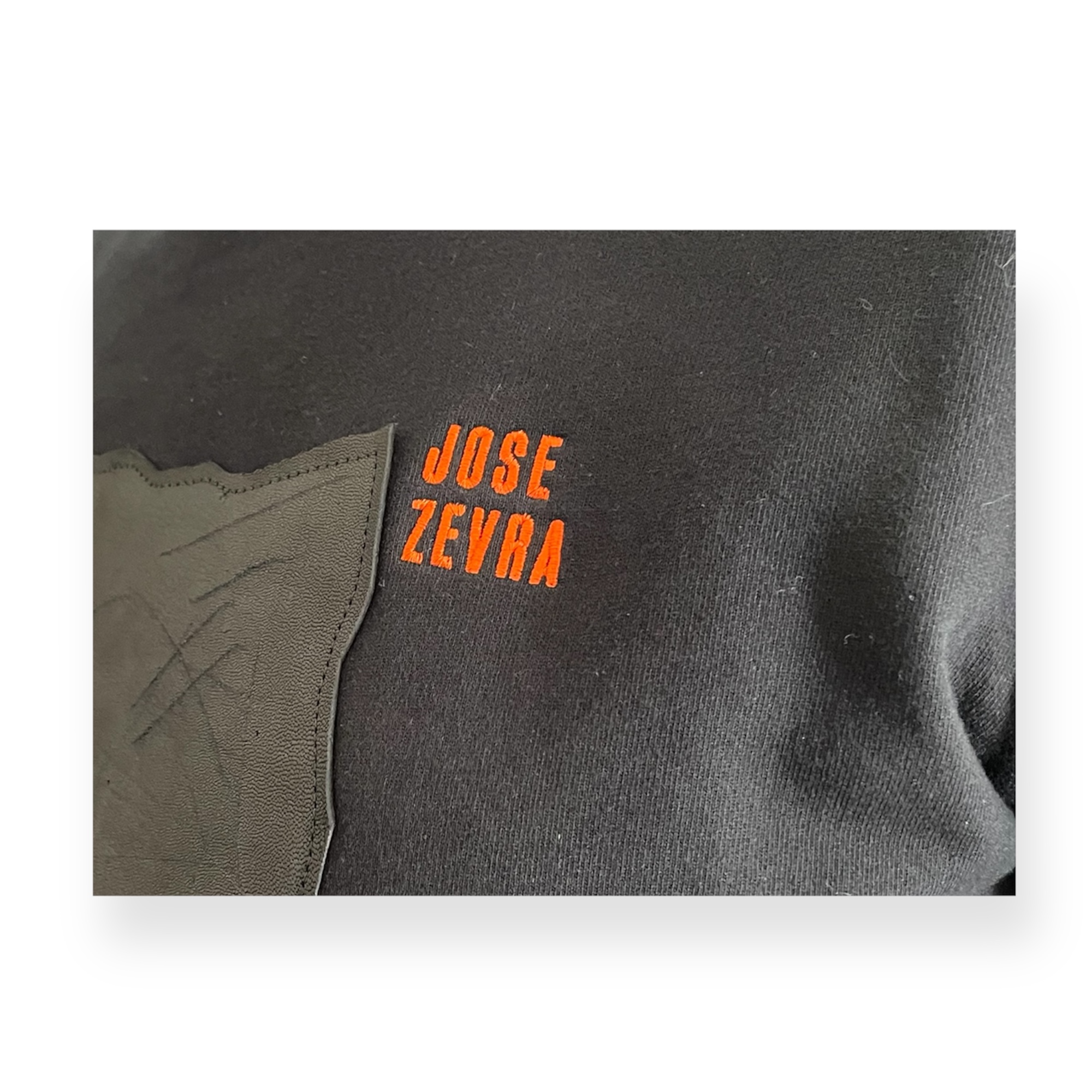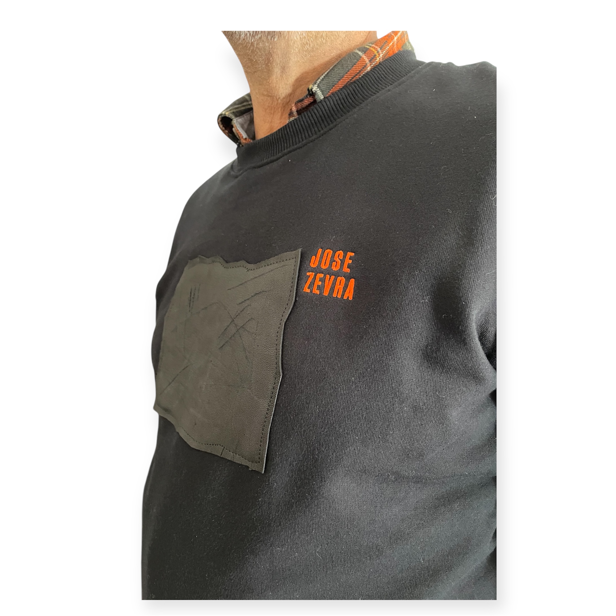 Sudadera básica 100% algodón orgánico color negro, cuadro deforme y rasgado de piel negra, logo bordado color naranja.