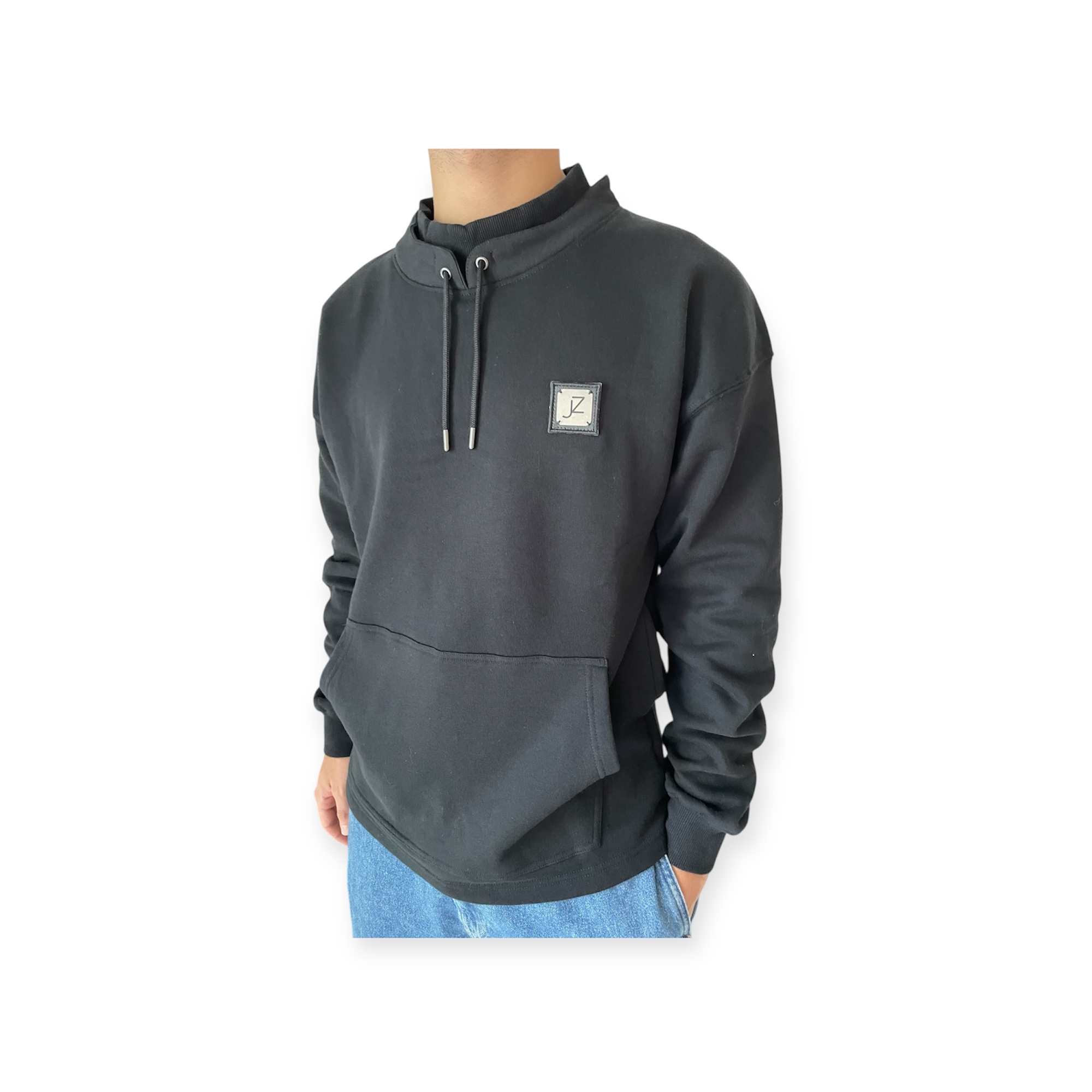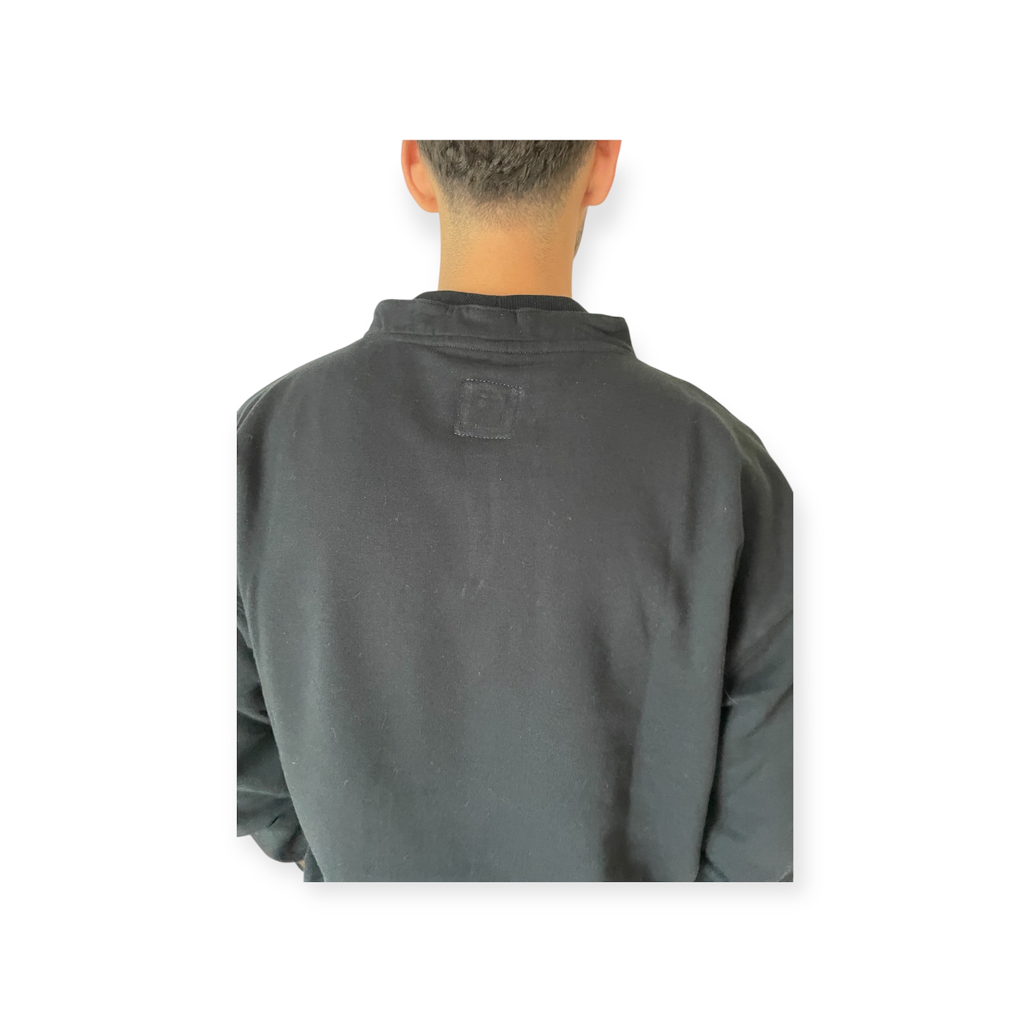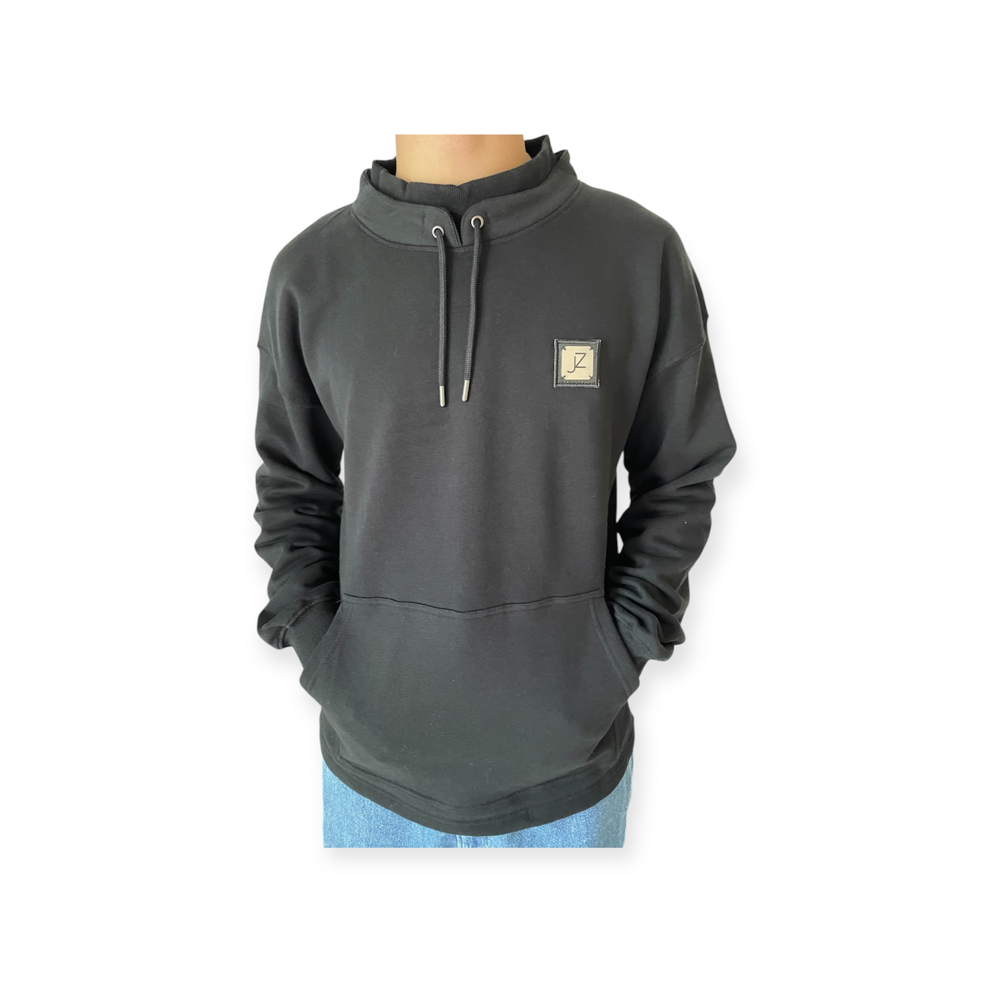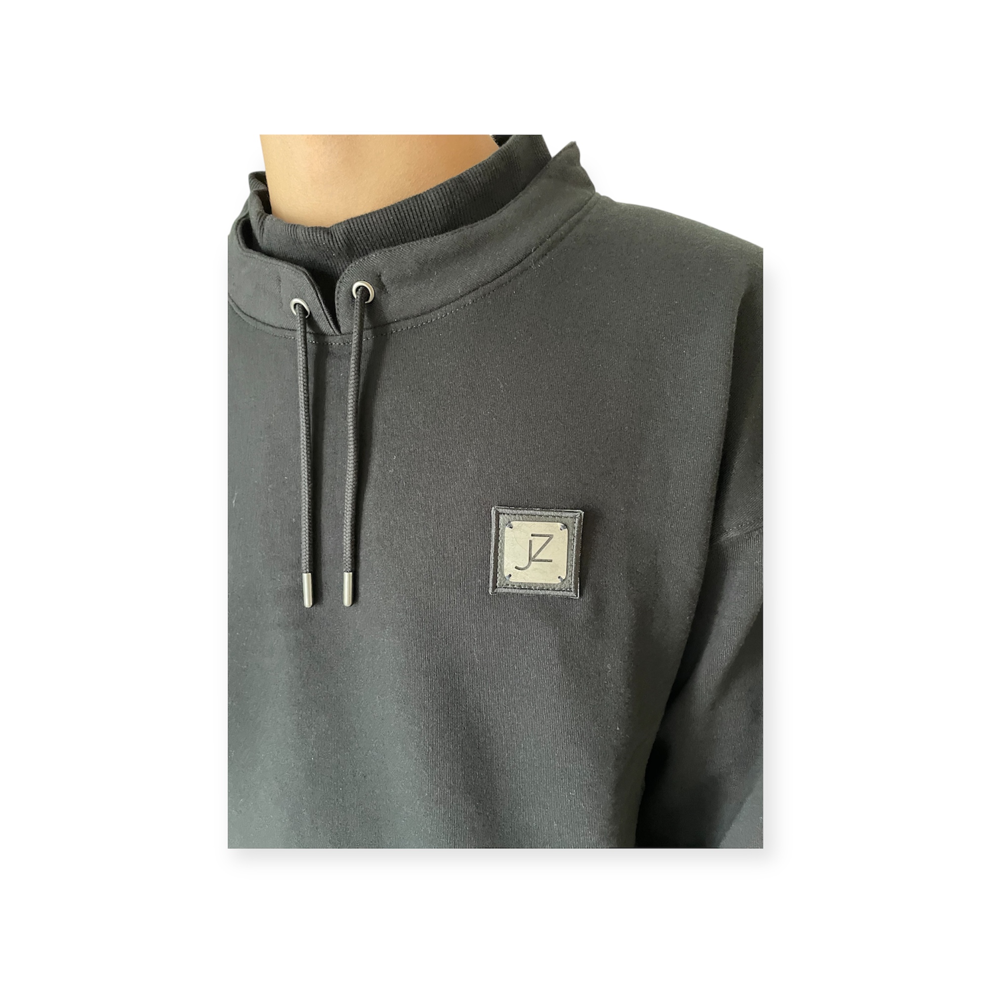 Sudadera negra algodón orgánico 100%, doble cuello sin capucha, logo metal JZ.