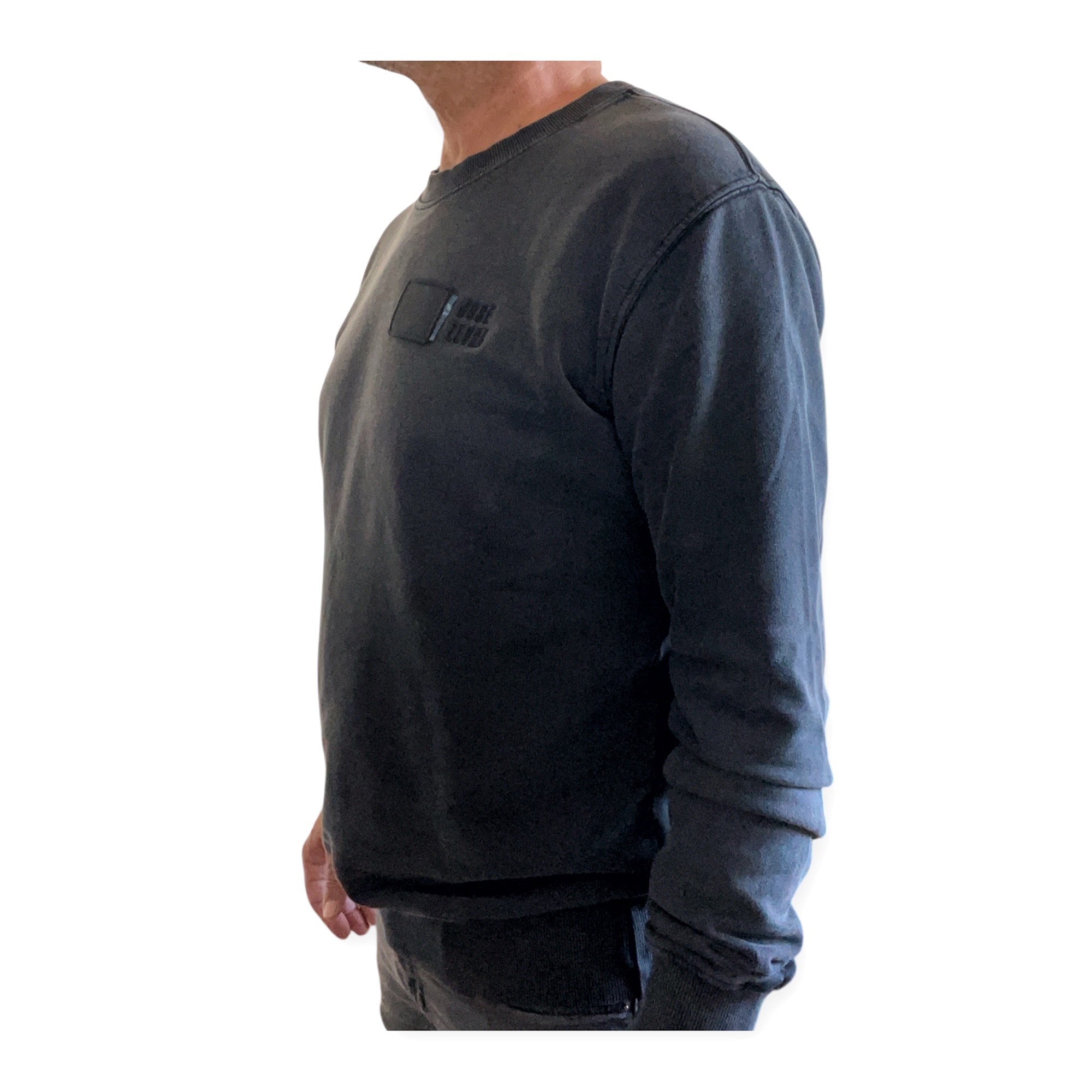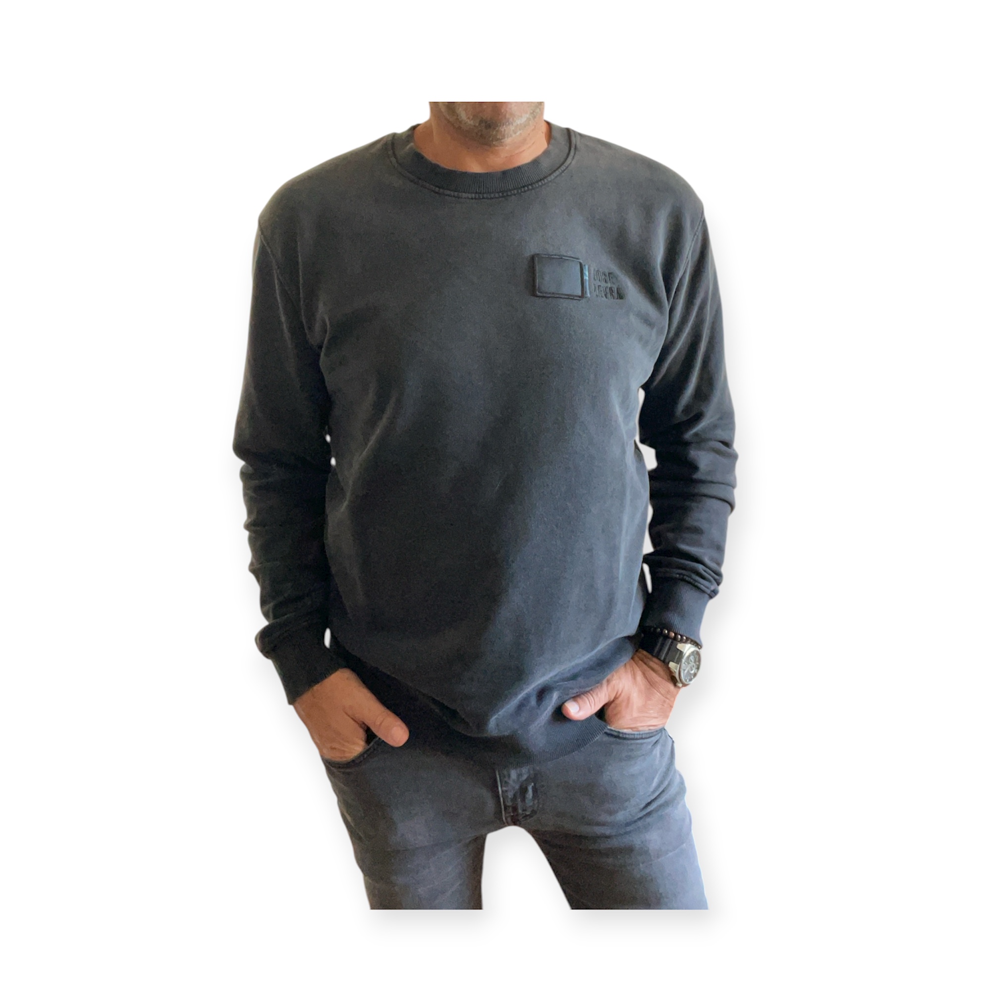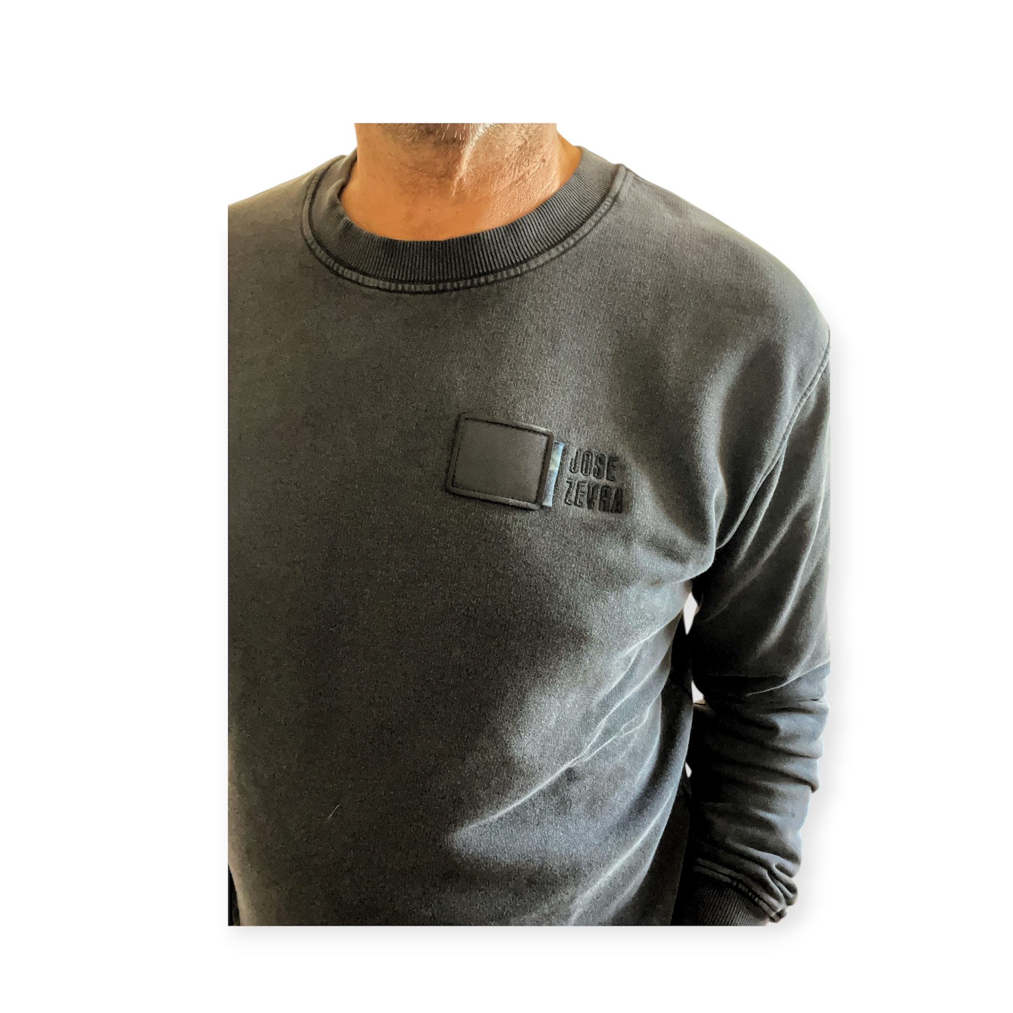 Sudadera 100% algodón orgánico color negro lavado a la piedra, detalle en pecho izquierdo cuadrado negro con festón y adorno vaquero, logo bordado en negro Jose Zevra.